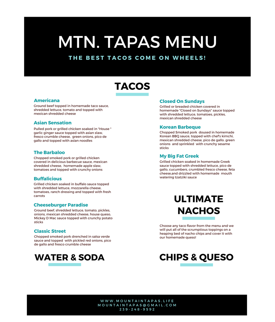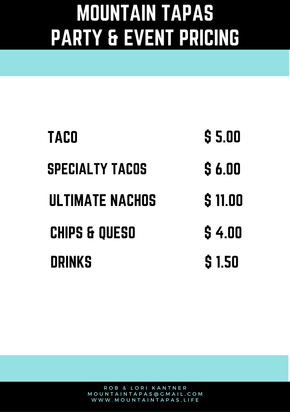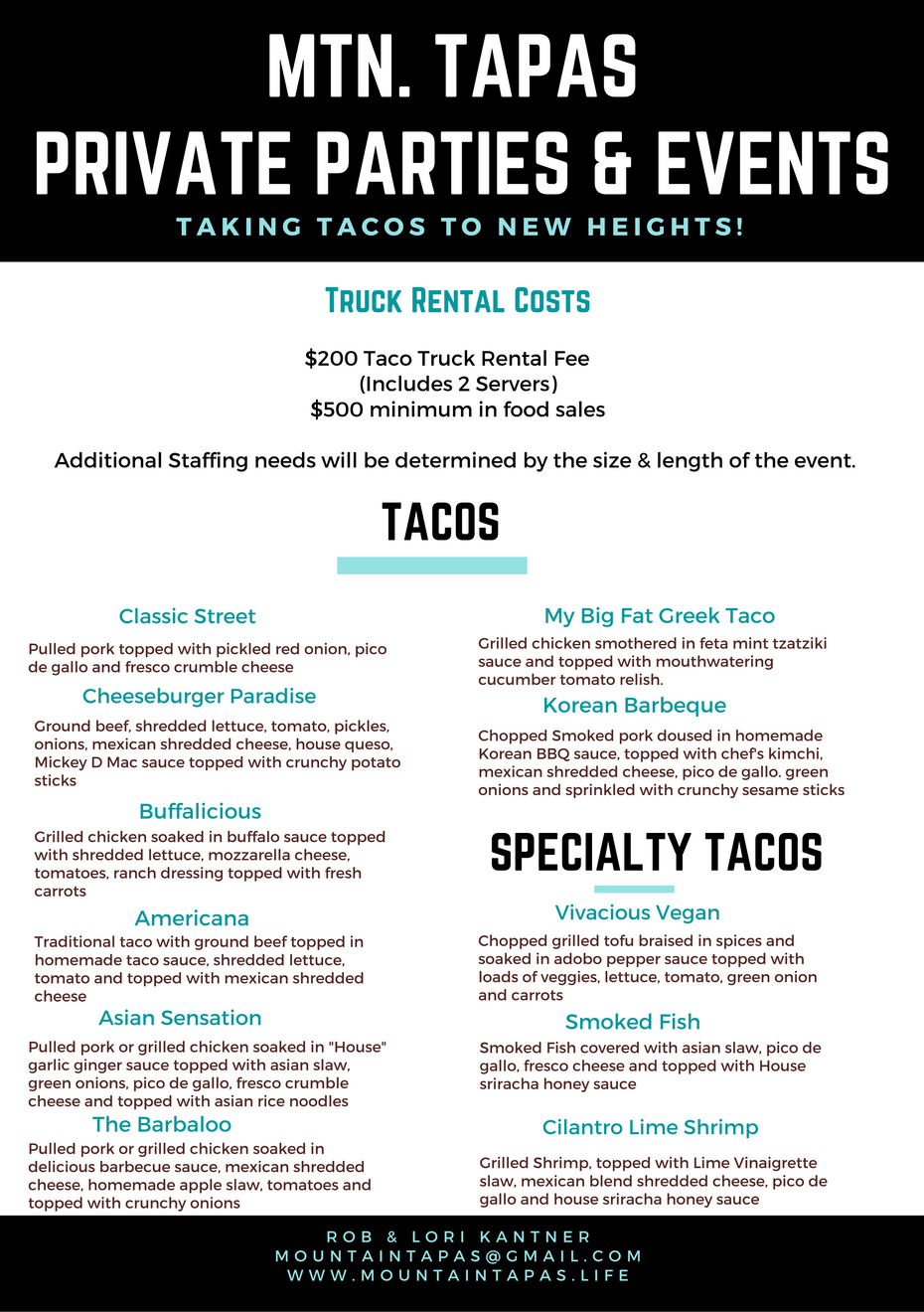 “We LOVE all Mtn. Tapas tacos!! We check FB frequently to see where we can get our “taco fix” next! Thanks Lori and company for all your hard work.”