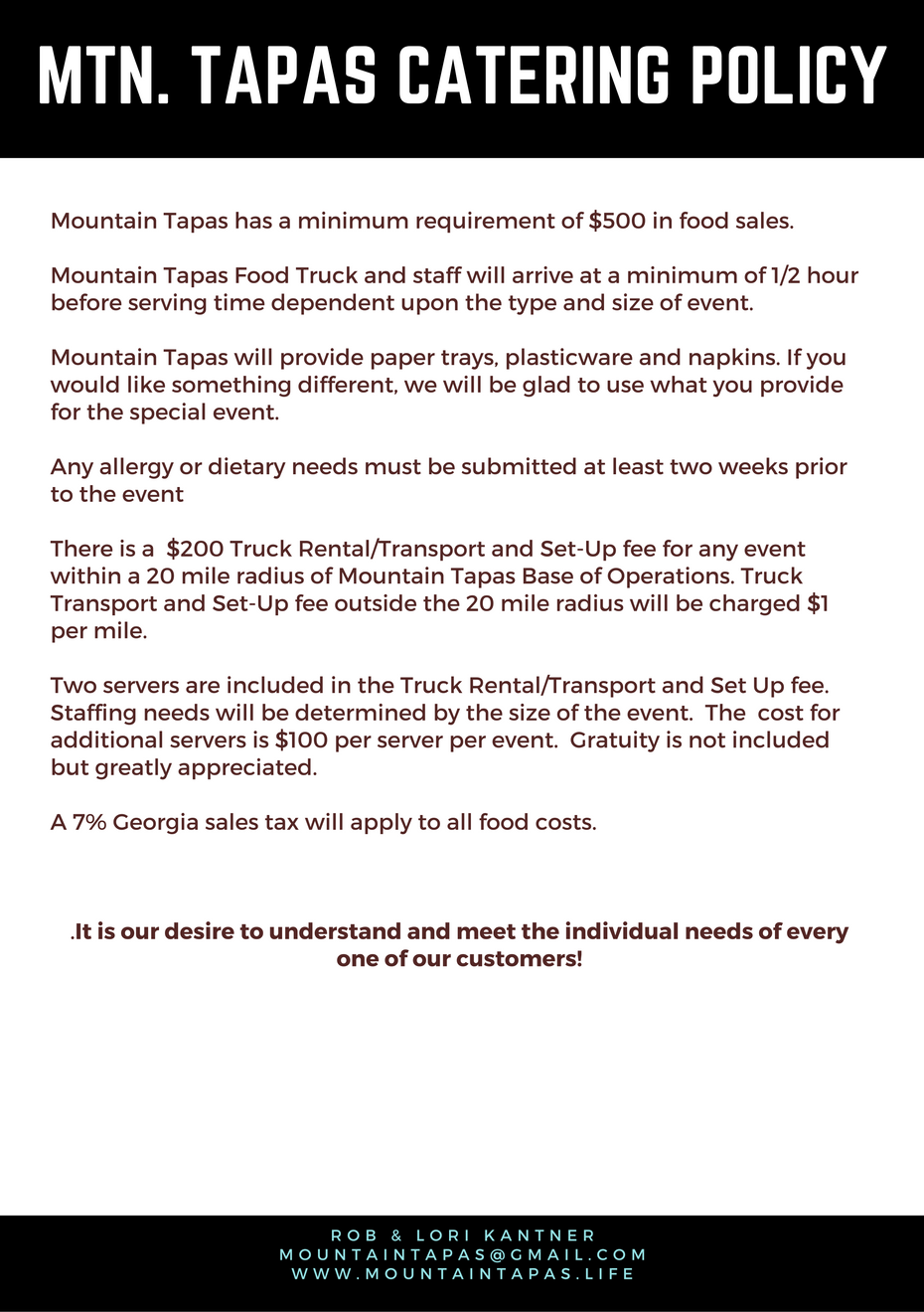 Rob and Lori were high school sweethearts and have been happily married for 35+ years! They have been blessed with four children and six grandchildren! In 2020, Rob turned to Lori and said, “You’ve followed me in all the places we’ve gone, it’s time for you to live out your dream” Lori’s dream was to own her very own food truck and cook and provide tasty food for others! Together, they began building their dream. Rob being a guy who can do anything handy, turned a basic horse trailer into a beautiful food trailer that fits so well in the beauty of the Blue Ridge Mountains! Lori’s sweet spot was creating and cooking tasty tacos that melt in your mouth! Together they created Mountain Tapas, living out their mission!